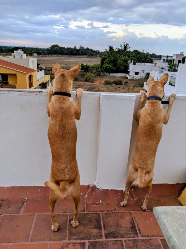 By then, Sarala would have finished watering the plants, and it was time to go back downstairs, waiting patiently for Amma to give us our biscuits. Some days when Amma was in a good mood, she also takes us upstairs, where we walk around and just enjoy along with her. When she sits down, we also sit next to her because she has this beautiful umm.. fingers, which will play around in our fur and on our skin, make us feel so wanted and loved. I enjoy that so much. I remember that evening when Amma was with us walking up and down and saw us both trying to hold onto to the terrace and see the back streets dogs quarrelling with two big dogs that lived in the road next to the Sai baba temple. Amma loved how we looked in that moment and clicked a picture—later showing it to me.